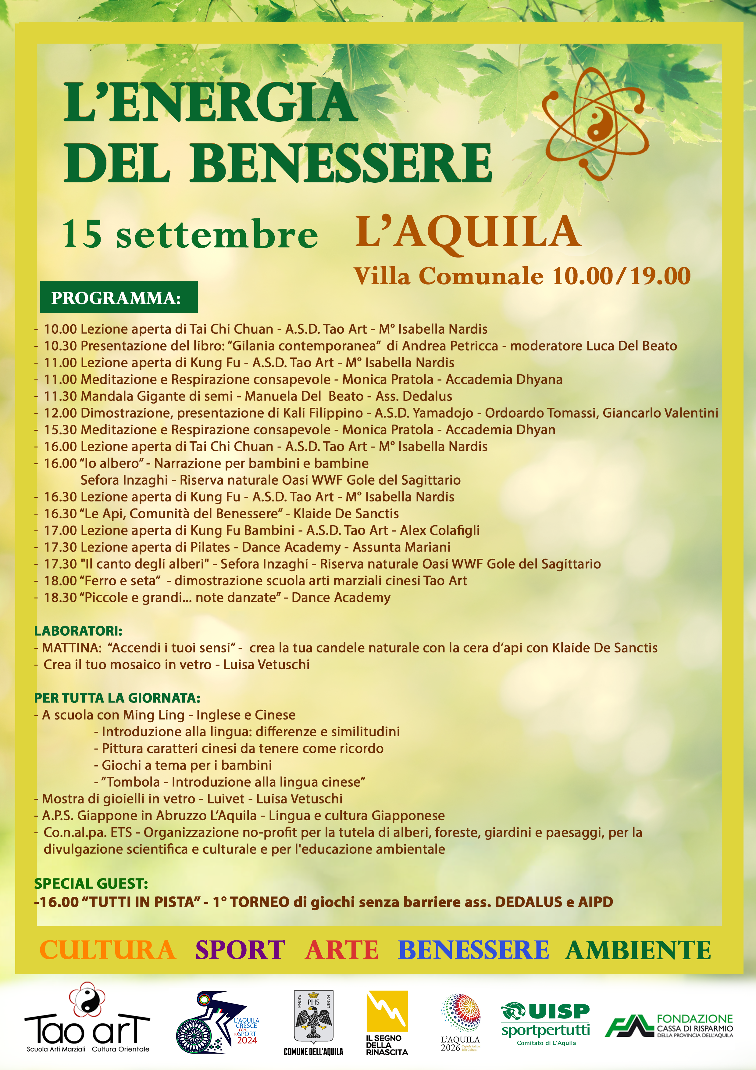 L’Associazione sportiva Tao Art presenta la seconda edizione de “L’Energia del Benessere” che si terrà alla Villa Comunale domenica 15 settembre dalle ore 10.00 alle ore 19.00. La manifestazione gode del patrocinio del Comune e rientra nel cartellone “L’Aquila cresce con lo sport”.